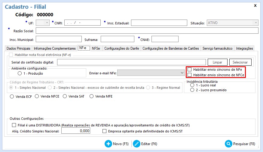 - Criado no cadastro de Filial na aba NF-e a opção de habilitar o envio síncrono de forma separada para as notas, sendo assim possível colocar para NF-e ou NFC-e ou ambos.