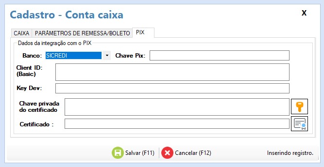 - Foi integrado a forma de pagamento PIX para o banco Sicredi, para configurar o mesmo, basta entrar no site do banco e acessar a conta e vai ter a área de “Outros Serviços” e após acessar basta gerar os dados do PIX, Gerar o certificado digital e preencher no cadastro de conta caixa assim como é feito no PIX com BB, porem tem q selecionar a opção Sicredi para esta preenchendo os dados, segue print da tela de preenchimento dos dados.