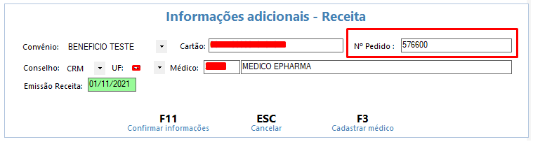 - Foi implementado na tela de “Informações adicionais - Receita” na venda de PBM e-Pharma o campo de “Nº Pedido” para esta informando o numero gerado pelo cliente via app de celular.