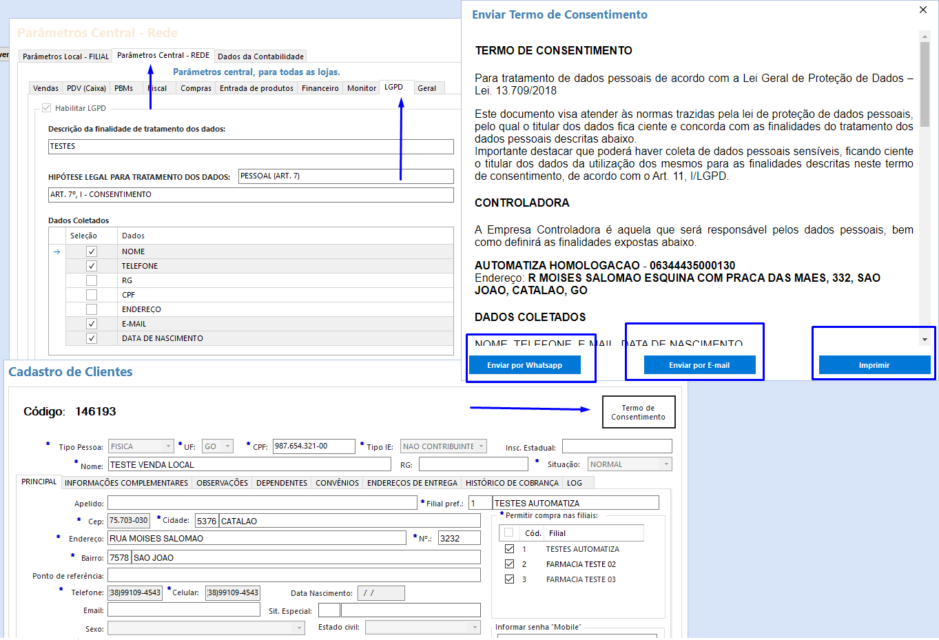 - Nos parametros do sistema também será possível personalizar o termo para clientes maiores de idade e menores de idade de forma distinta.