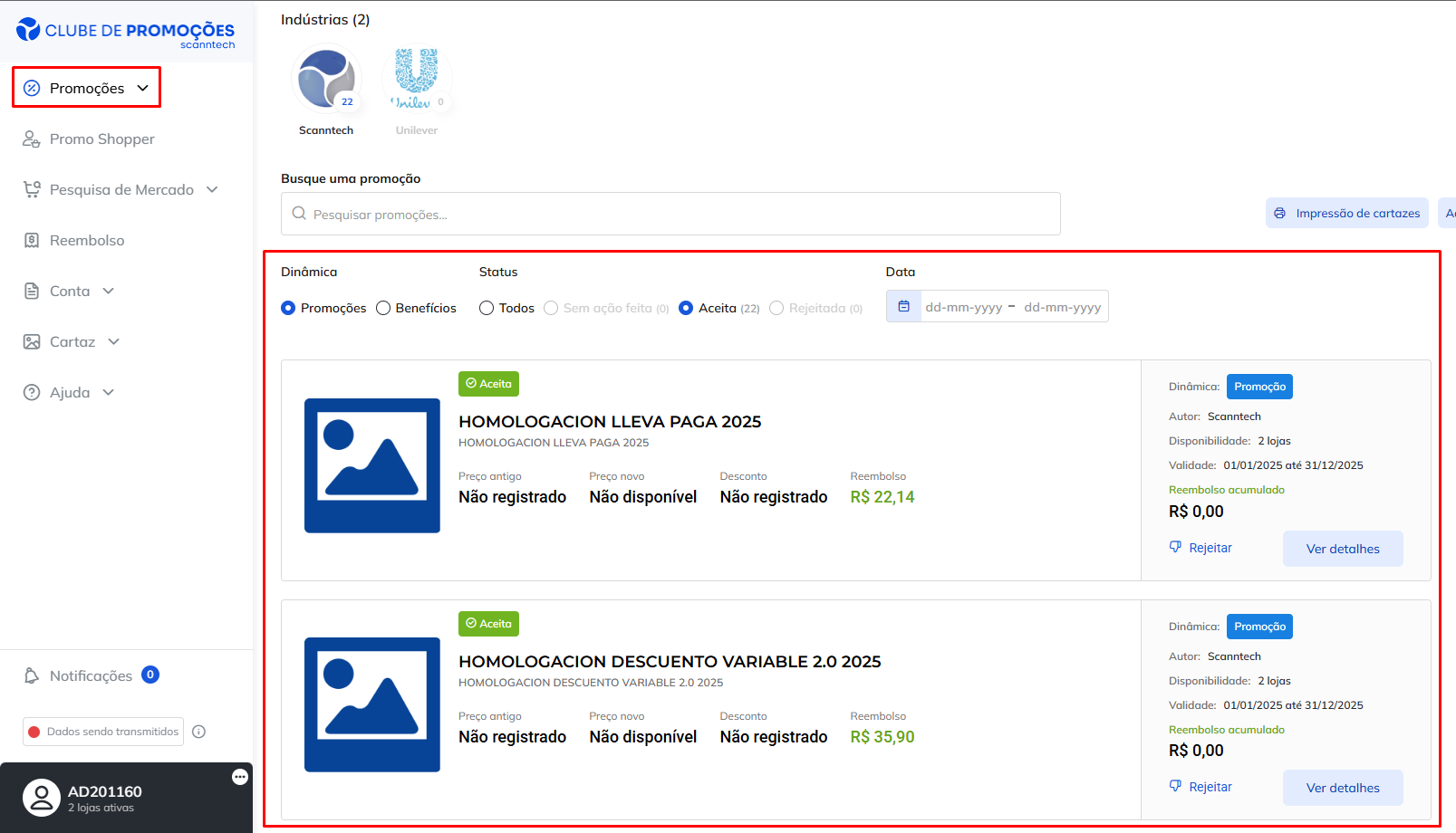 Entre com as credenciais fornecidas pela equipe da Scanntech. Depois de acessar, clique no menu “Promoções” para ver todas as ofertas disponíveis e escolher quais deseja aceitar ou rejeitar conforme seu interesse.