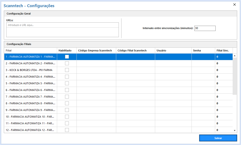 Na seção "Configuração Geral" são definidas as informações comuns a todas as filiais habilitadas. Inicialmente são duas, a URL de comunicação, que é fornecida pela equipe da Scanntech e o intervalo de sincronizações, que é basicamente o tempo que o sistema aguarda antes de enviar um novo ciclo de informações. Por padrão esse intervalo é de 30 minutos, mas pode ser ajustado manualmente conforme a necessidade das filiais.