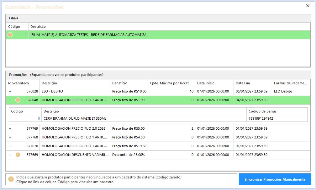 Assim como no exemplo acima, sempre que não for localizada uma mercadoria com o EAN correspondente à promoção, tanto a filial quanto a promoção ficarão com um ícone de atenção, indicando para que seja realizado o cadastro ou associação à um cadastro existente. Assim que realizado/selecionado cadastro, mercadoria será associada a promoção e vendas serão automaticamente realizadas de acordo com o benefício oferecido pela promoção.