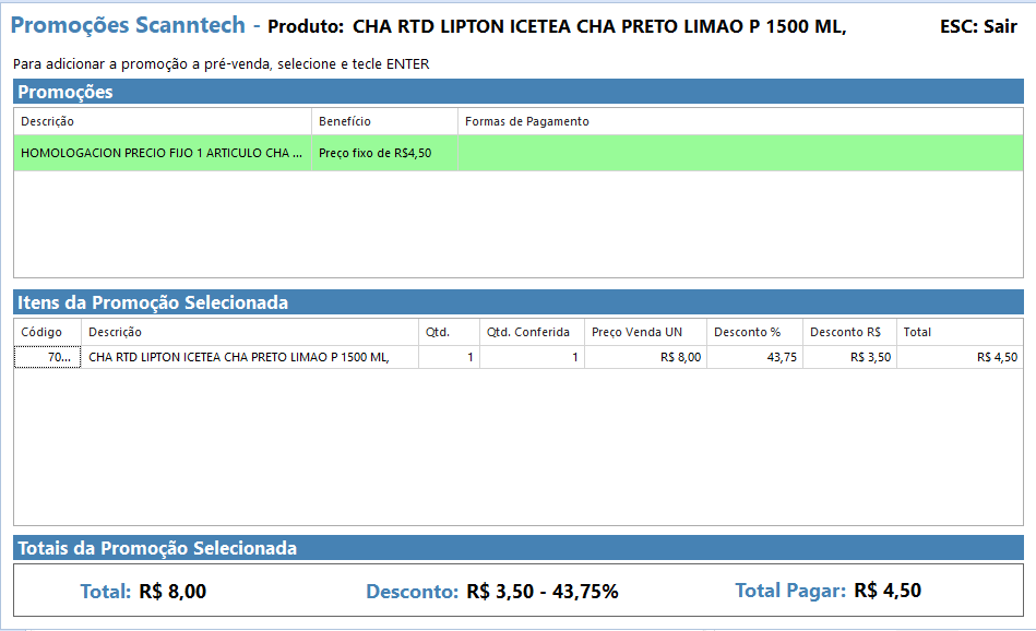 Uma vez ativas, sempre que a mercadoria for bipada nas rotinas de venda e pré-venda automaticamente será exibida a tela informativa da promoção, discriminando valores e outras informações: