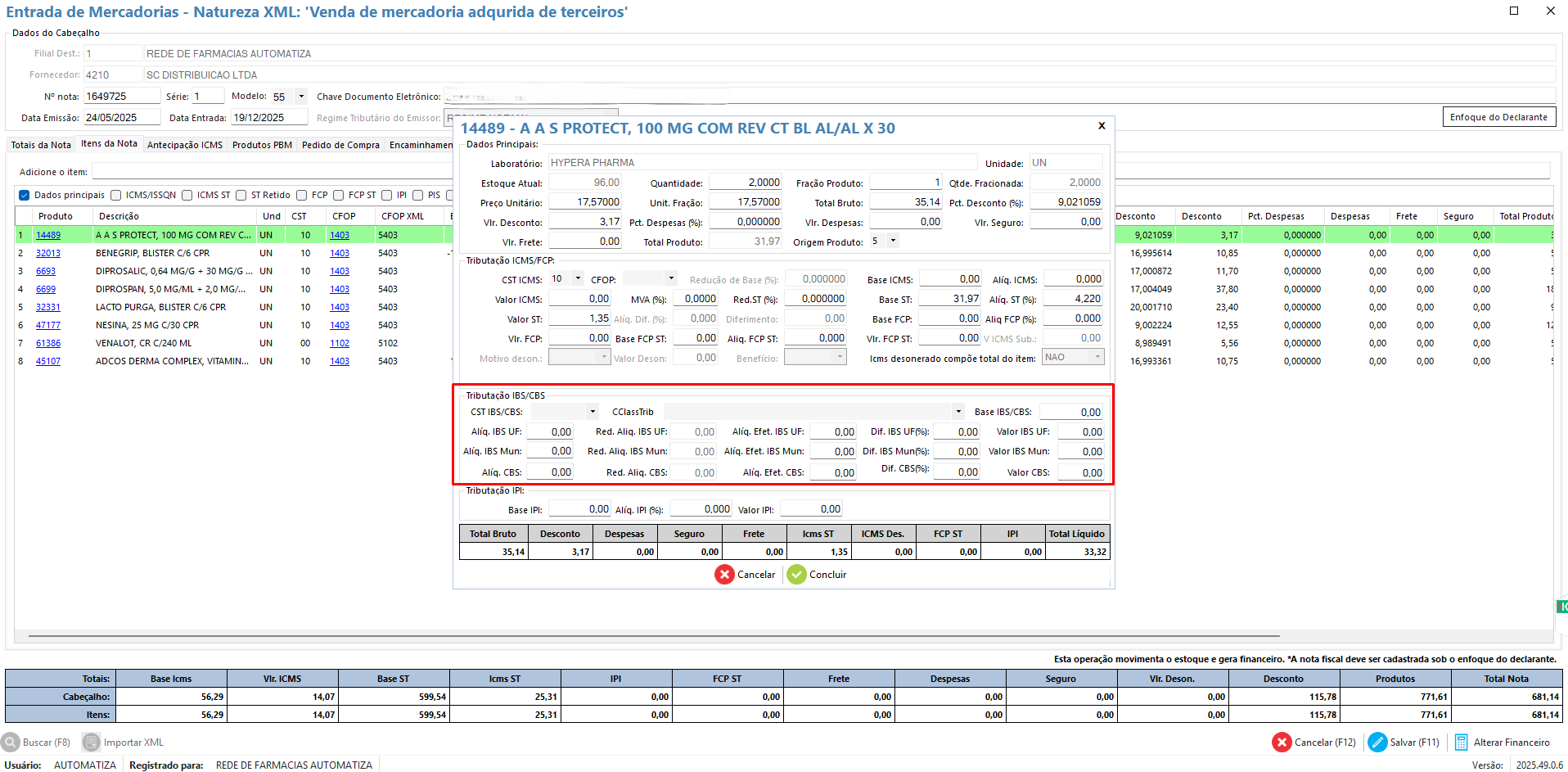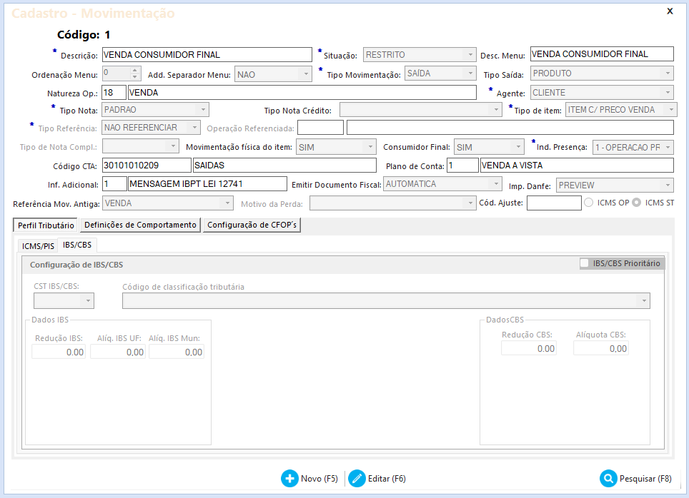 Tendo em vista que a nova legislação versa mais sobre operação do que sobre o produto em si, foi criada uma nova aba de tributação no cadastro de movimentações, onde será possível definir uma tributação que será aplicada a todas as mercadorias da movimentação em questão, quando não houver tributação definida no cadastro da mercadoria.