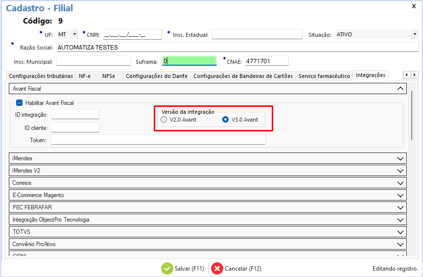 Consultas relativas a nova tributação já foram liberadas também em ambos parceiros fiscais. Para o iMendes, versão 2 da integração já retornará tributação completa tanto em atualização individual, no cadastro da mercadoria, quando em atualização em lote. Da mesma forma ocorre também com o Avant, porém para integrações Avant será necessário habilitar também a versão 3 da integração no cadastro de filial, como na imagem abaixo.