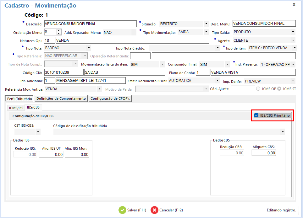 Dessa forma será permitindo então configurar operações não onerosas com facilidade, definindo tributações específicas para movimentações específicas e quando não marcado como prioritário, respeitando o que foi definido no cadastro da mercadoria.